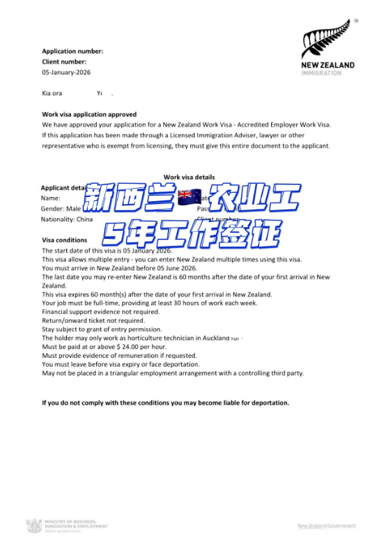 山東恒德國際再傳捷報!新西蘭農業類 5 年工作簽證成功落地,為想要出海就業的伙伴打通正規通道!